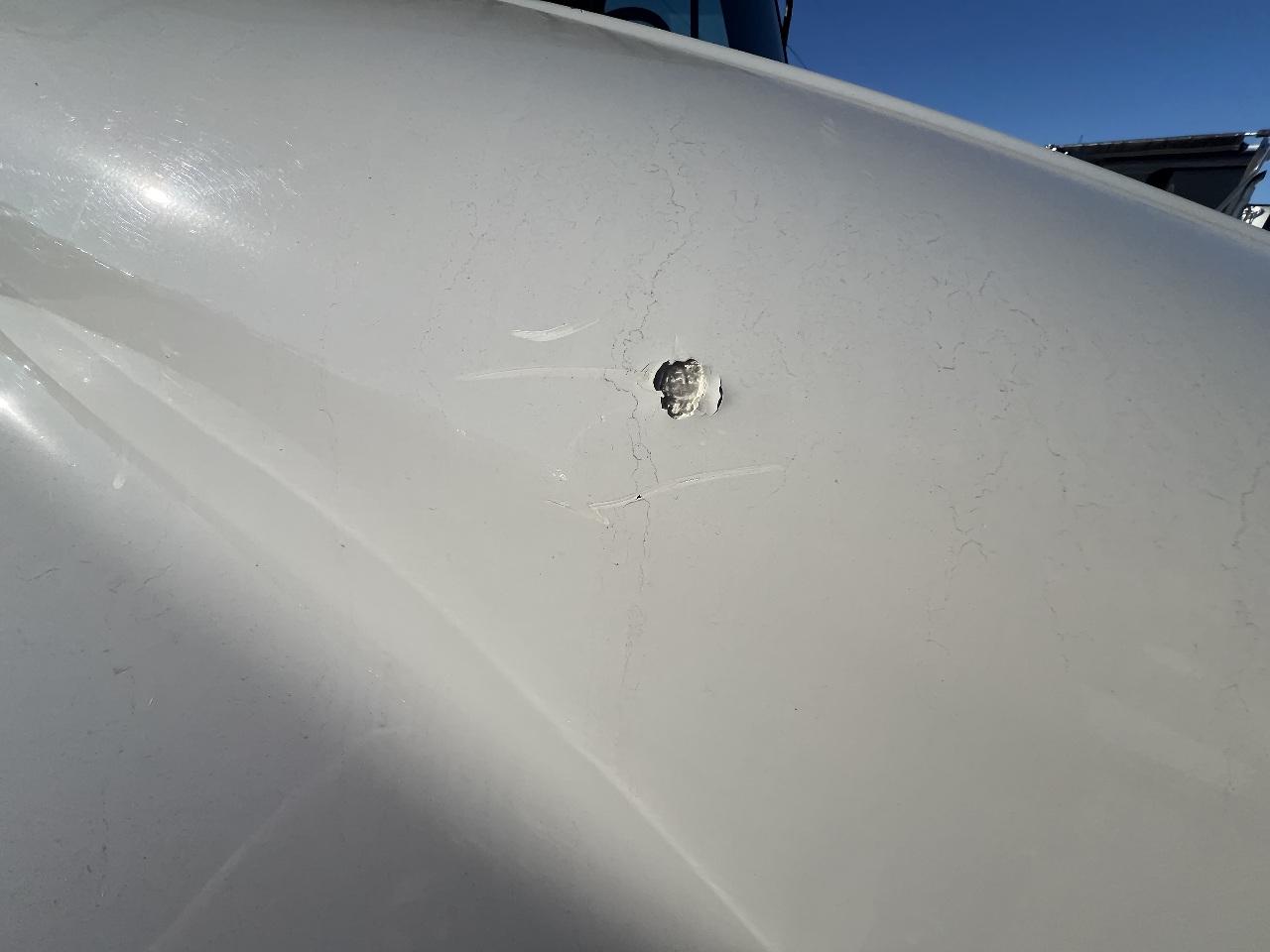| HOOD | CRACKED AND CHIPPED ON PASSENGER SIDE - SCRATCHED BY HEADLIGHT ON DRIVER SIDE |